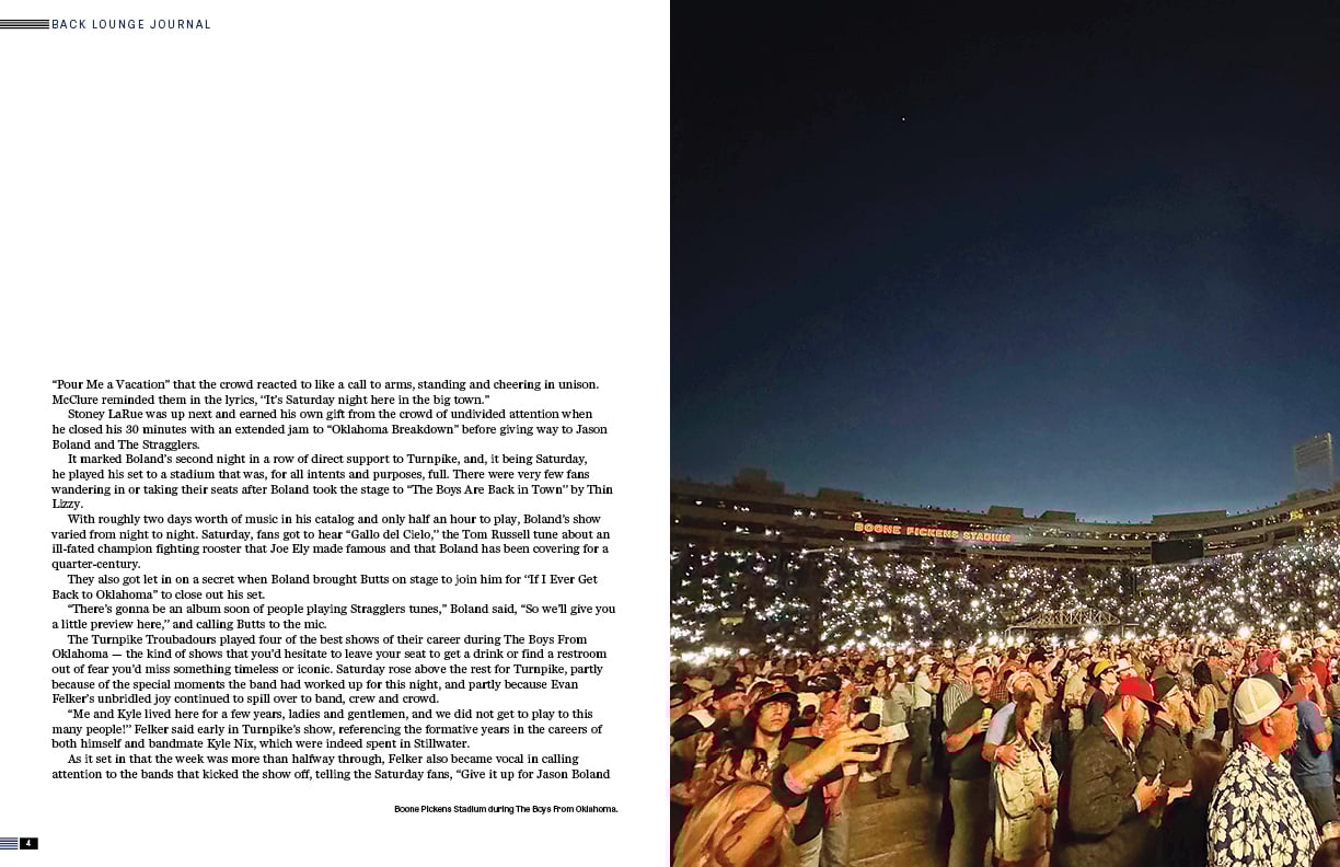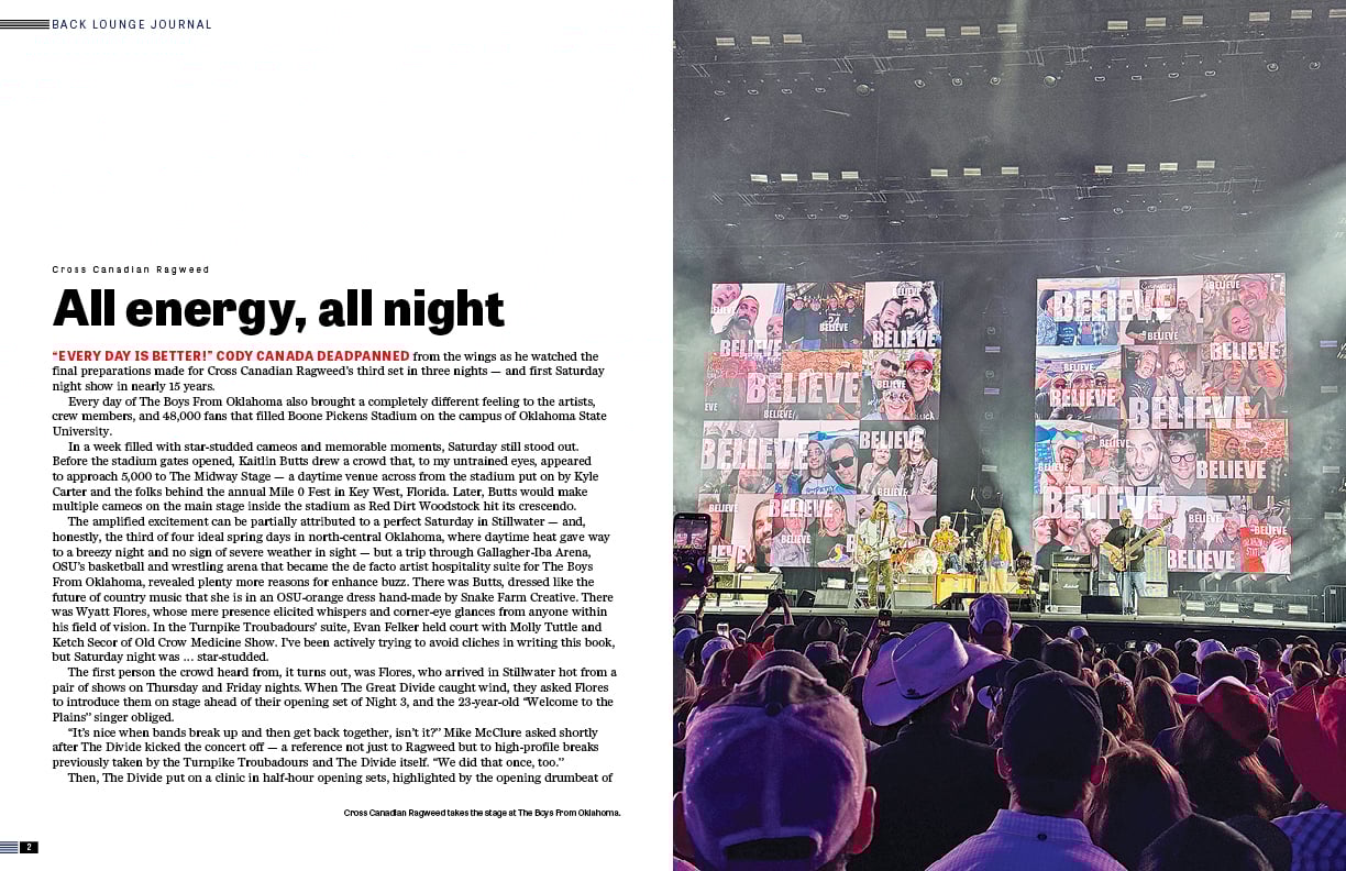 When the party ends this year, you can capture the thrilling return of The Boys From Oklahoma to Stillwater forever. Red Dirt's Return is a commemorative, full-color keepsake magazine dedicated to bringing you the atmosphere and pageantry that Cross Canadian Ragweed, the Turnpike Troubadours, Wyatt Flores, Shane Smith and the Saints, and The Great Divide are bringing back to Oklahoma for one night in April. More than 80 pages of concert recaps, behind-the-scenes interviews and gripping photography will let you relive this year's Boys From Oklahoma weekend whenever you wish, and as often as you like. This is the latest project from The Back Lounge, home of Oklahoma native Josh Crutchmer — author of (Almost) Almost Famous, Never Say Never and Red Dirt Unplugged. This one-of-a-kind magazine prints as soon as the weekend ends and will be in the hands of fans in a matter of days.